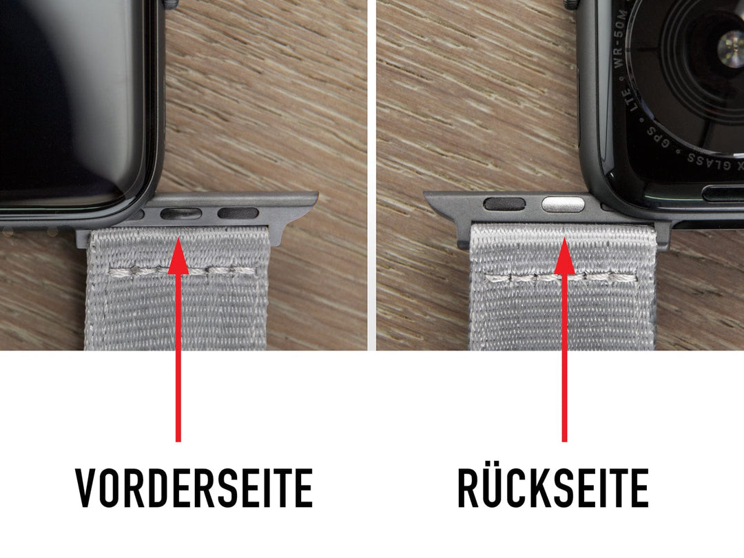 Schieben Sie den Adapter in den Schlitz Ihrer Apple Watch, bis Sie ein Klicken hören. Um ihn zu entfernen, drücken und halten Sie die Armbandlösetaste auf der Rückseite der Uhr und schieben Sie das Armband heraus.