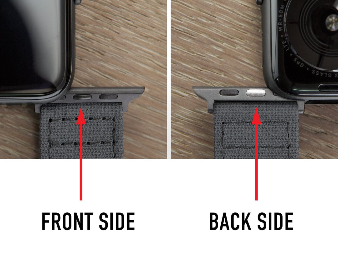 Make sure the side of the adapter with the three black ovals faces the front of your Apple Watch and the side with the silver oval in the middle faces the back of your Apple Watch, or it won't fit correctly.