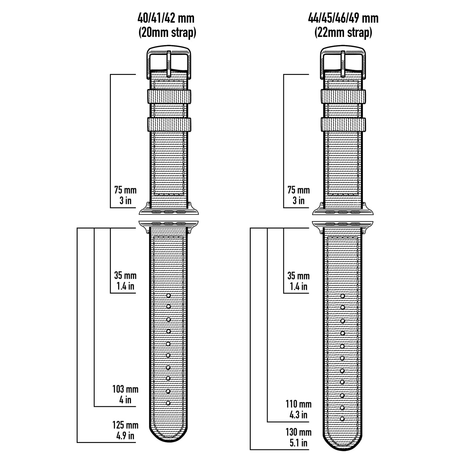 Our nylon straps are military style, but designed for modern tech. Unlike traditional one-piece military straps, these leave the watch’s back clear, ensuring seamless functionality.