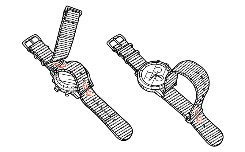 - Thread the main strap through the watch's spring bars, behind the watch