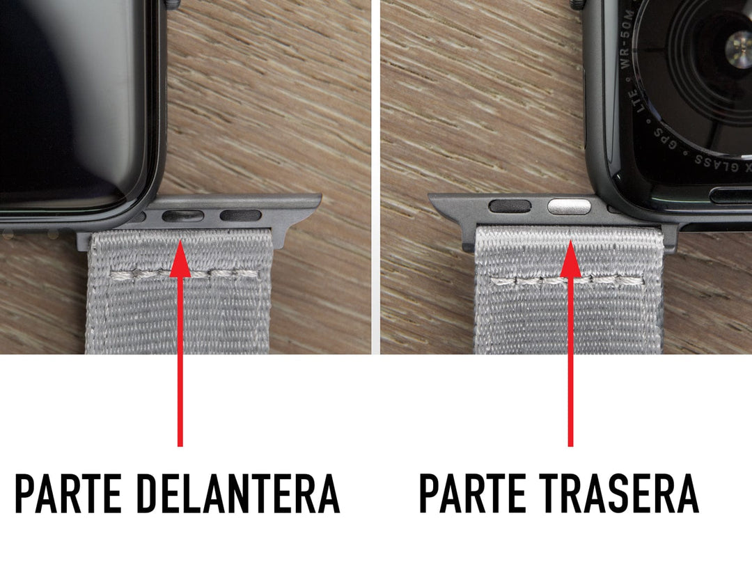 Comprueba que el lado del adaptador con los tres óvalos negros mira hacia la parte delantera del Apple Watch y la parte con un óvalo plateado en el centro hacia la parte trasera; si no es así, no encajará bien.