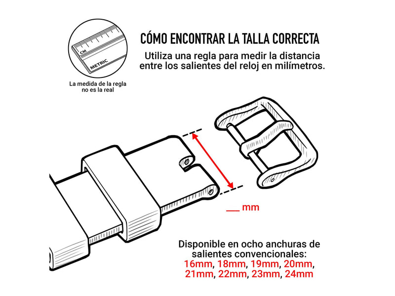 Es importante asegurarse de tener el tamaño correcto para una correa determinada antes de pedir una hebilla. Algunas correas son cónicas, por lo que el tamaño no siempre coincide con el ancho de la correa. Usando una regla métrica, simplemente mide la distancia, en milímetros, del ancho de la correa donde se une a la hebilla. Ese ancho es tu tamaño de hebilla.