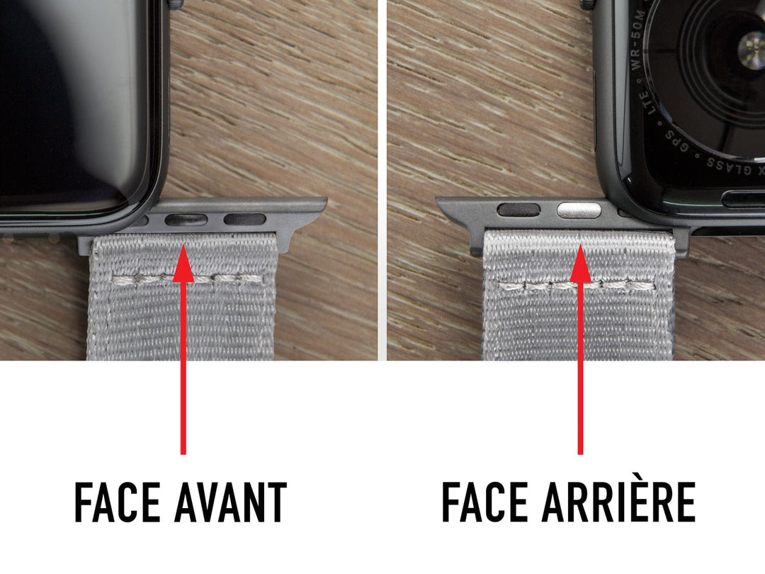 Faites glisser l'adaptateur dans la fente de votre Apple Watch jusqu'à entendre un clic. Pour le retirer, appuyez et maintenez le bouton de libération du bracelet au dos de la montre et faites glisser le bracelet.