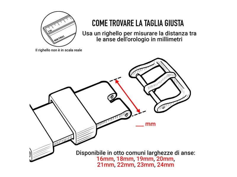 È importante assicurarsi di avere la taglia corretta per un determinato cinturino prima di ordinare una fibbia. Alcuni cinturini sono affusolati, quindi non è sempre uguale alla larghezza del cinturino. Usando un righello metrico, misura semplicemente la distanza, in millimetri, della larghezza del cinturino dove si attacca alla fibbia. Quella larghezza è la tua taglia di fibbia.