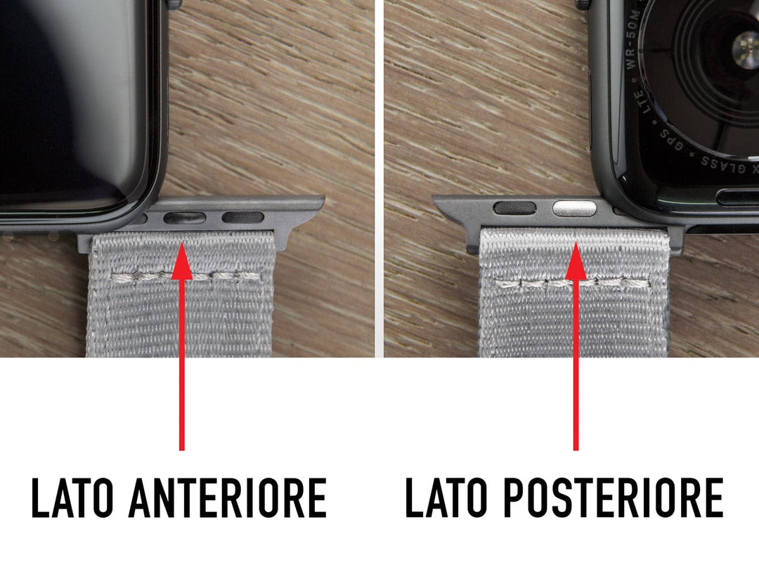 Assicurati che il lato dell'adattatore con i tre ovali neri sia rivolto verso il fronte del tuo Apple Watch e quello con l'ovale argentato al centro verso il fondello. In caso contrario, il cinturino non si adatterà correttamente.
