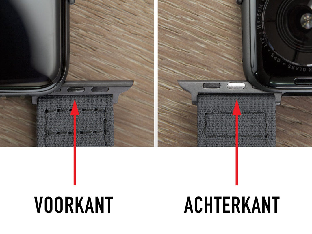 Zorg ervoor dat de zijde van de adapter met de drie zwarte ovalen naar de voorkant van uw Apple Watch wijst en de zijde met de zilveren ovaal in het midden naar de achterkant, anders past het horloge niet goed.