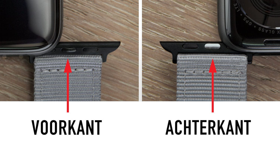De zijde met de drie zwarte ovalen moet naar de voorkant van uw Apple Watch wijzen en de zijde met de zilveren ovaal in het midden naar de achterkant. Onjuiste oriëntatie verhindert een goede pasvorm.