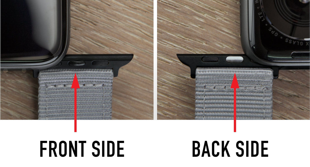The side with three black ovals should face the front of your Apple Watch, while the side with a central silver oval should face the back. Improper orientation will prevent proper fitting.