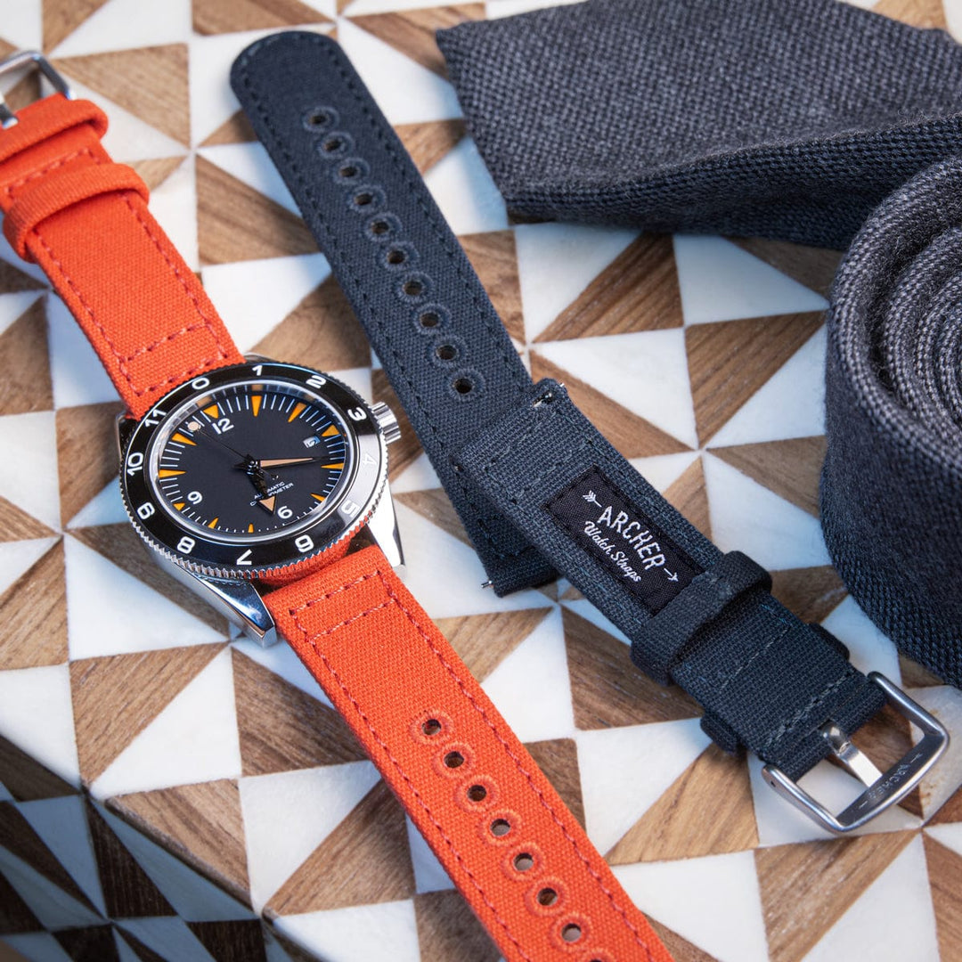 With top-notch craftsmanship and a clean, minimalist design, the quick-release canvas strap adds a vintage touch to any watch. It features an Archer-signed brushed stainless steel buckle, and each hole is carefully embroidered with precise stitching that won't get pulled or frayed.