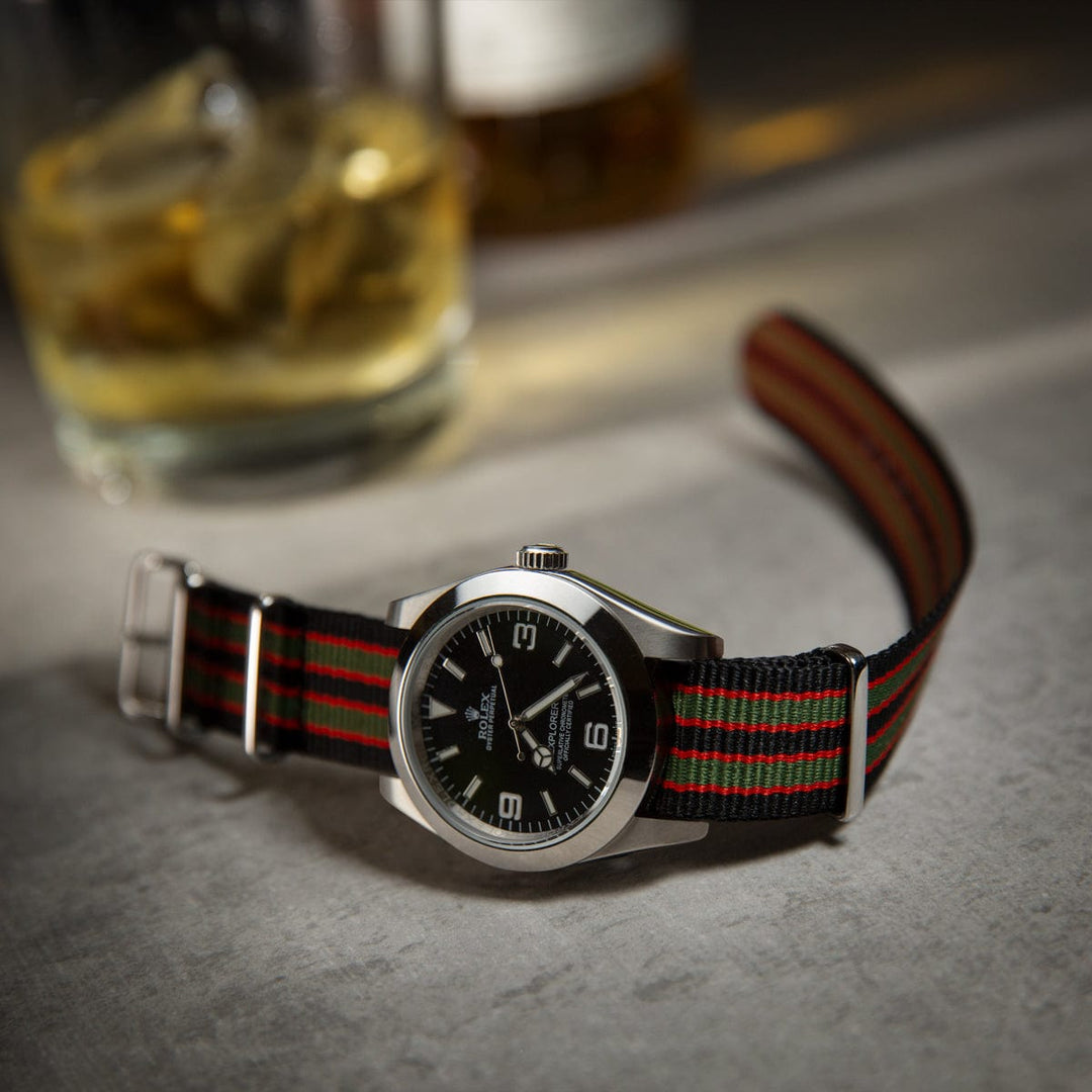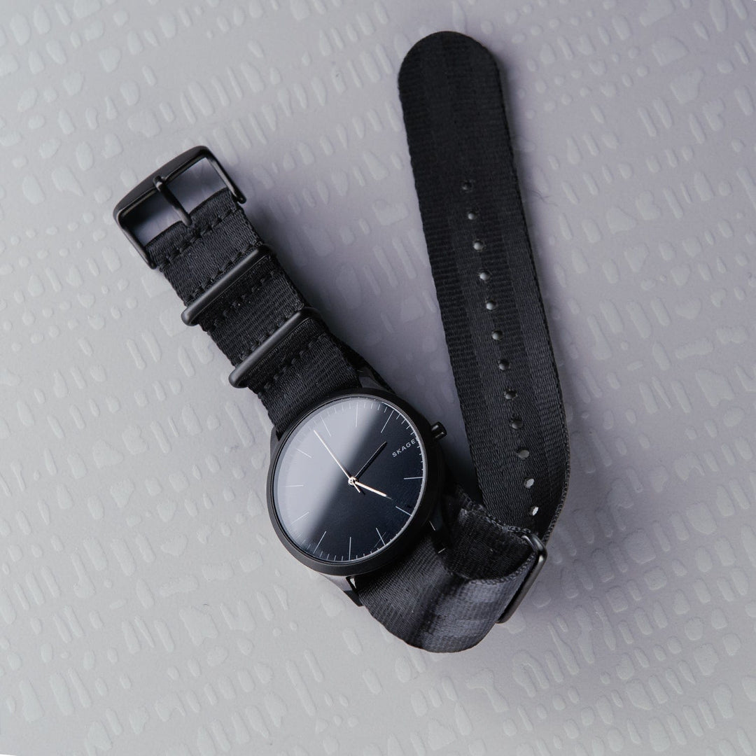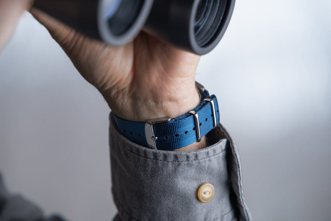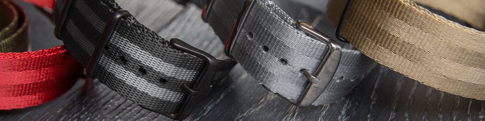 Made from premium seat belt-woven nylon, this military-inspired strap combines durability with comfort. Its solid construction features heavy-duty stitching and stainless steel hardware made to match your timepiece.